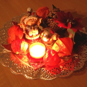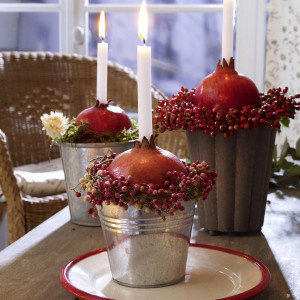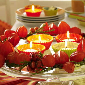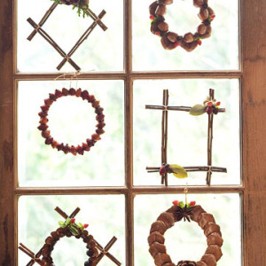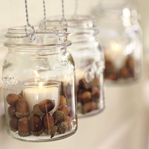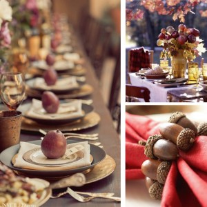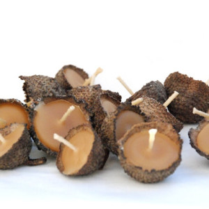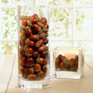 Прогуливаясь осенним лесом или парком, следует внимательней смотреть под ноги, так как именно там самые внимательные могут найти основу для своих поделок. Например, с шишек можно сделать оригинальное кольцо для салфеток. Желудям и орехам найдется место и на праздничном столе – ими можно украсить салфетку, поместить в стеклянную вазу или просто разложить на скатерти в произвольном порядке. При этом их можно покрасить золотой или серебряной краской. Также можно в стеклянный подсвечник поместить дары природы — орехи либо желуди и поставить в центр большую свечу.