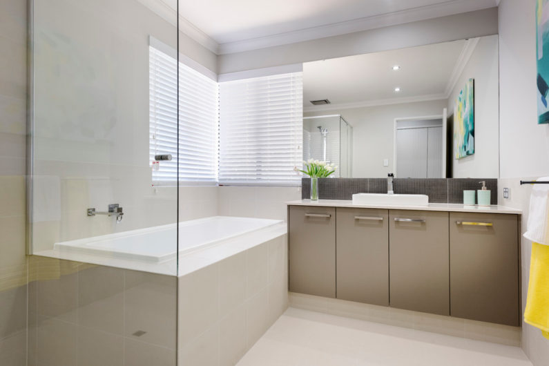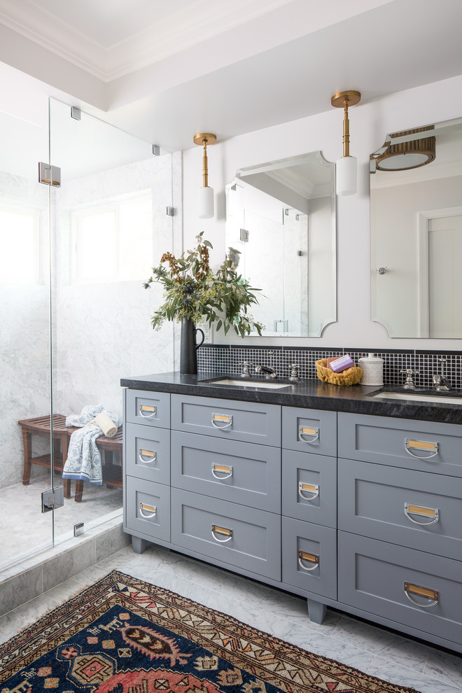 Светлая ванная комната, в идеале, должна быть дополнена элементами с теплым мерцающим свечением, например, медной или золотистой фурнитурой, вставками теплых натуральных оттенков в плиточной кладке на стенах. Так, ваше отражение будет более здоровым и радующим взор, а значит, и настроение с самого утра станет лучше.