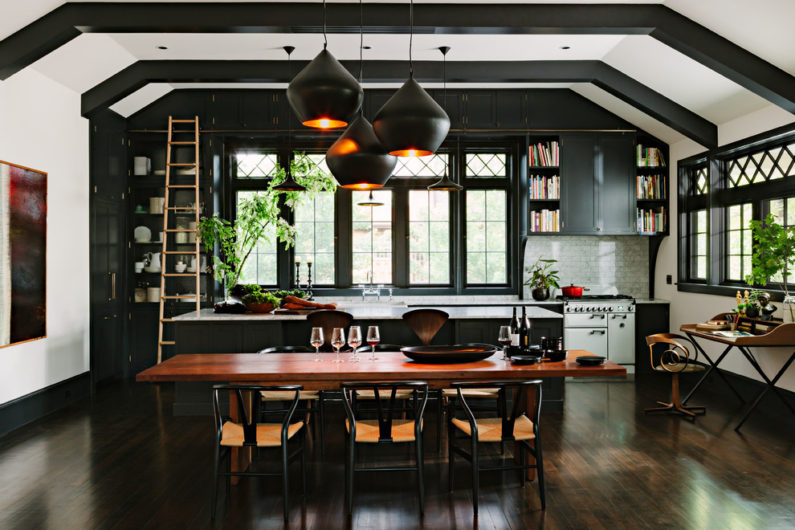 Пространство темной кухни выглядит особенно притягательно, когда в нем каждая деталь продумана до мелочей, а обстановка грамотно разбавлена элементами из дерева или его имитации.