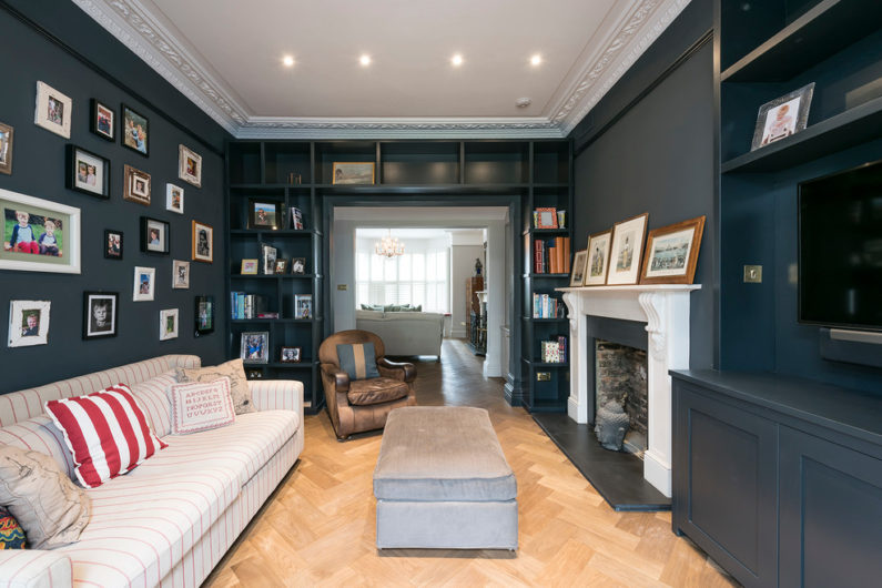 Выбирая темные оттенки при оформлении гостиной, рекомендуется использовать их, к примеру, для напольного покрытия и стен. При этом, важно разбавлять подобное пространство светлыми элементами (мебель, двери, аксессуары, шторы). Потолок лучше оставить как можно более светлым – он визуально сделает помещение выше и легче. Ну а если вместо темного пола выбрать природный оттенков, скажем, светлый древесный, то его сочетание с белым потолком минимизирует ощутимое влияние темных стен.