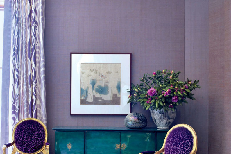 С разными оттенками натуральной древесины ультрафиолетовый выглядит по-разному, но всегда выигрышно. Успех этот можно легко объяснить в силу того, что природные спокойные тона, характерные для всех пород дерева, будто гасят порывистую натуру ультрафиолетового цвета. Так, он становится приглушенным, а значит, в интерьер выгляди вполне органично, мягко и уместно.
