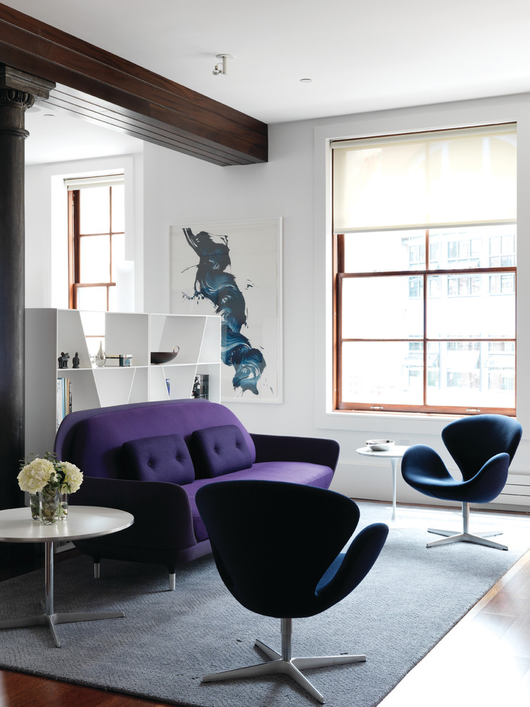 Большинство людей, мы уверены, назовут ультрафиолетовый оттенок мало пригодным для интерьера. Тем не менее, в окружении правильных оттенков и натуральных фактур он не будет смотреться таким фантастическим и отстраненным, а теплый пурпурный тон в его составе будет даже согревать комнату.