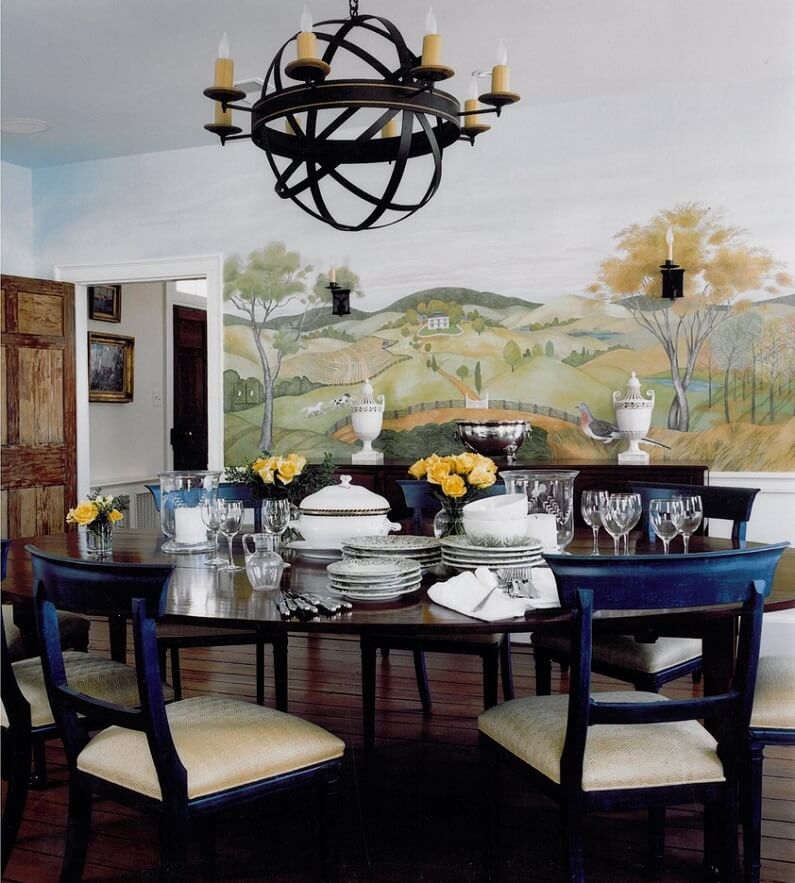 Современные фрески могут быть нанесены не только на стену, но и потолок, молдинги и карнизы, двери и мебель. С их помощью можно несколько размыть границы помещения, сформировать иллюзию объема на стенах, если наносить перспективные или панорамные изображения пейзажей.