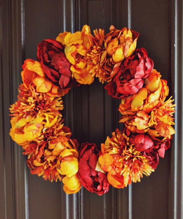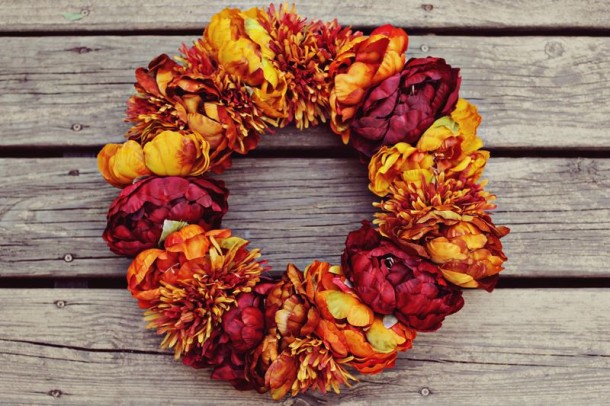 Хотя осень все еще не вступила на свой сезонный трон, именно сейчас мы можем застать последние цветы и реализовать великолепную идею от блога abeautifulmess.com — осенний венок из больших ярких цветов.