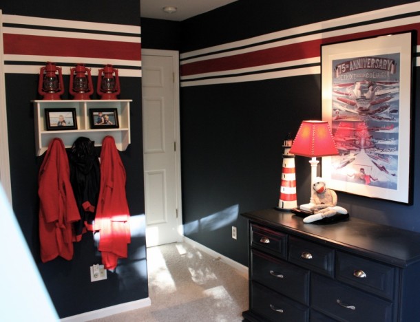 4. Сделать акцент можно и одной (несколькими) горизонтальной полосой. Ее можно провести под самим потолком, невысоко над полом, или по центру стены. Выбор цветов и высоты полностью зависит от вашего настроения и фантазии.