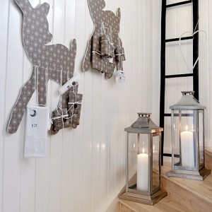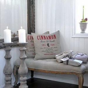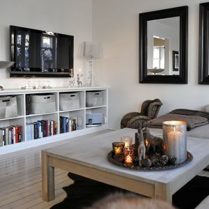 Просторная и светлая гостиная украшена рождественскими венками и гирляндами из ели, а её основным элементом является большой белый диван Ikea с множеством декоративных подушек собственного дизайна Jeanett. По соседству разместилась открытая столовая, изюминкой которой выступает огромная кристальная люстра и роскошный стол от ILVA, оббитый черной кожей, с комплектом стульев от Ikea.