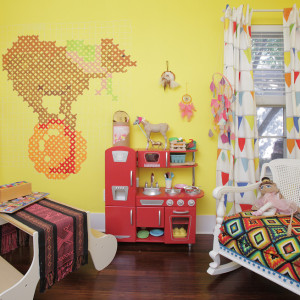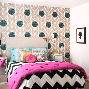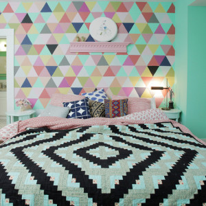 Бесспорный хит этой весны — яркие разноцветные треугольники. Такая стена в вашем доме станет центром внимания. На этом примере мы можем видеть, как легко освежить, уже поднадоевшую обстановку — оклеить всего одну стену яркими обоями. Во-первых, это быстро, а во-вторых, не так затратно, как ремонт всего помещения.