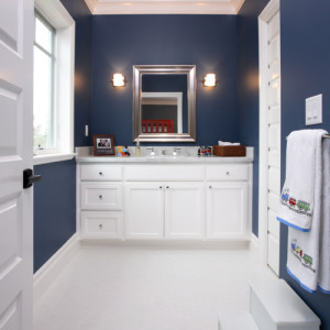 Прелестью оформления стен темным и глубоким цветом станет то, что вы можете приобретать белую и другую очень светлую мебель, и при этом она будет великолепно смотреться на контрастном фоне. Здесь же можете поэкспериментировать со светлым полом. Также совершенно по-другому на фоне синих стен выглядят такие актуальные нынче белые двери, оформленные светлыми наличниками дверные проемы и светлые стеновые панели.