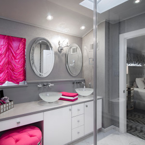 - Играйте с фактурами. Стальной цвет может быть шелковистым на ощупь, например, в виде чехлов на стульях и банкетках, или фрагмента обоев в ванной. К нему лучше подобрать предметы розового оттенка с матовой фактурой, и наоборот: для искристой фуксии – сдержанное серое окружение.