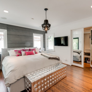При оформлении спальни можно поиграть с оттенками серого как основного цвета, подбирая более светлый для стен, а темный — для мебели и текстиля. Сделать красивый акцент можно с помощью лососевого оттенка для одной из стен или изголовья кровати.