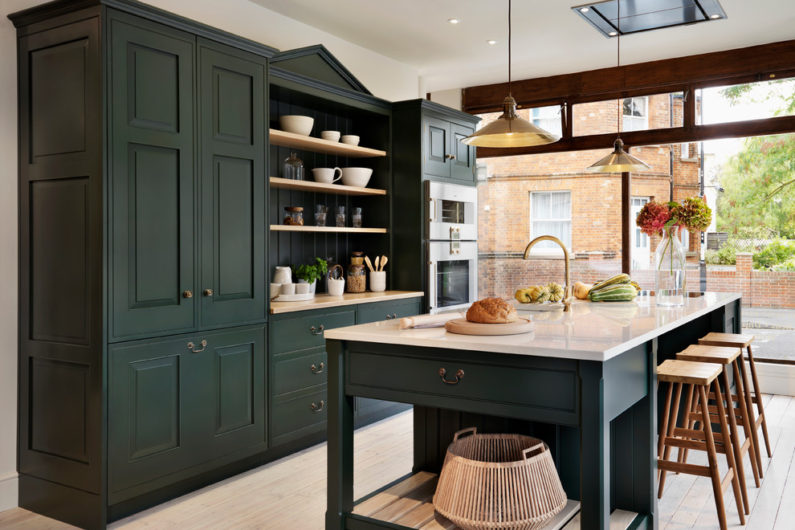 С теплым оттенком зеленого цвета, наоборот, хорошо сочетается насыщенный шоколадный или цвет черного дерева, поскольку натуральная зелень нейтрализует воздействие подобных оттенков.