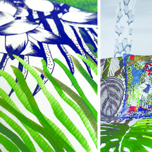Помимо плетенной мебели, в тропическом стиле встречается большое количество мебели, обтянутой тканными гобеленами с изображением тропиков и джунглей — пальмы, лианы, птицы и животные из той местности.