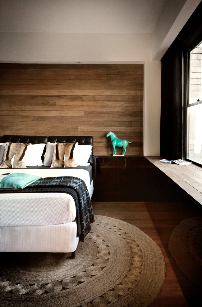 Крупно вязанные объекты (ковры, панно или покрывала) выгодно подчеркнут брутальную кирпичную кладку стен или природную фактуру дерева на полу