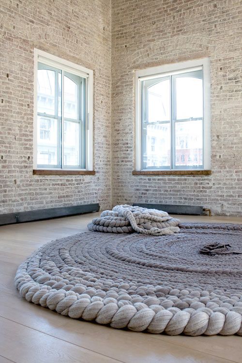 Предметы особенно крупной вязки сегодня находятся в статусе ультра модных вещей. К тому же, с их помощью декораторы создают модные и неожиданные сочетания и композиции. Например, комбинируют в одной зоне коврик, вывязанный из толстых нитей — канатов, с легендарными стульями или креслами Эймс (Eames) и хлопковым текстилем