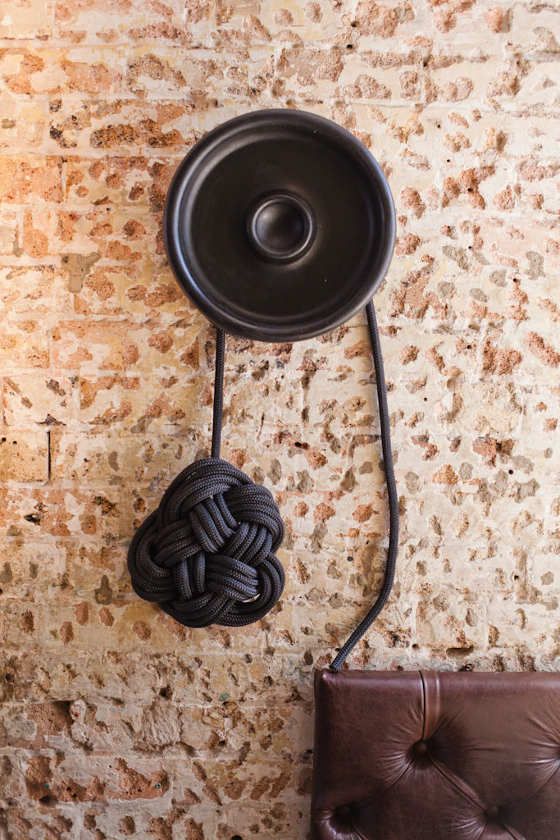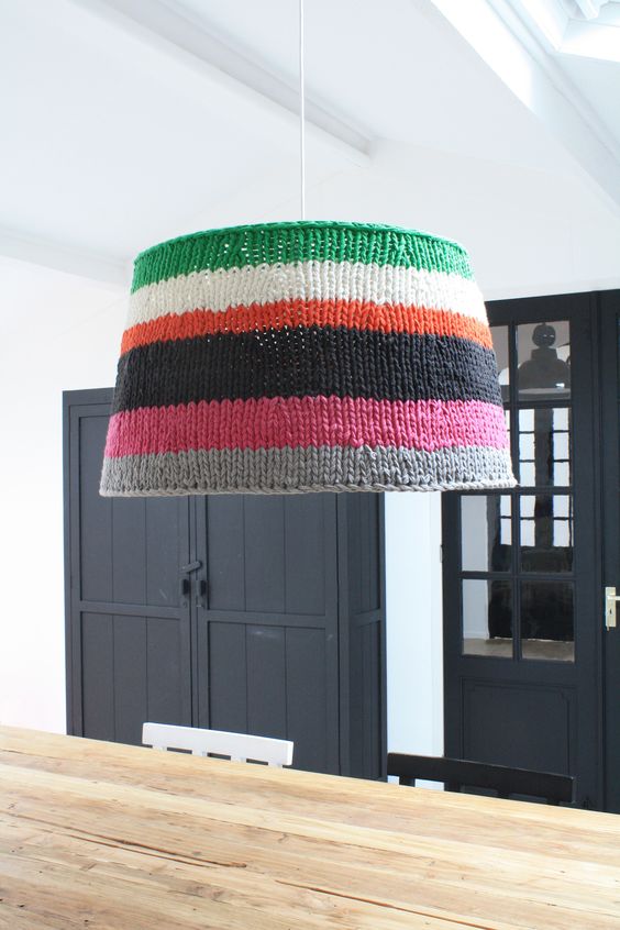 В качестве примера можно рассмотреть варианты с цветными абажурами, связанными из акриловых нитей, или различных декоративных объектов из толстого хлопкового жгута в качестве украшения стен, дверных и оконных проемов.