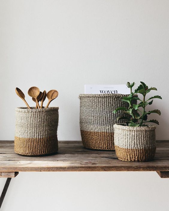 Нам очень нравится идея плетеных чехлов для кухонных емкостей, цветочных горшков или в качестве самостоятельных жестких контейнеров, в которых можно хранить самые разнообразные предметы и вещи. В спальне — сложить плед, книги или ночной крем для рук, в гостиной у камина — вязку дров, в детской — игрушки, в столовой — фрукты или овощи.