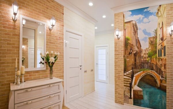 По мнению известных дизайнеров, дальняя стена напротив входной двери должна быть украшена красивым ярким изображением парусника или морским пейзажем в светлых тонах. Входящий человек должен сразу ощутить тепло и яркость бытия. Прихожая – это лицо хозяев квартиры или дома. Она должна быть светлой, даже если недостаточно освещена, показывать гостеприимность, живущих здесь людей.