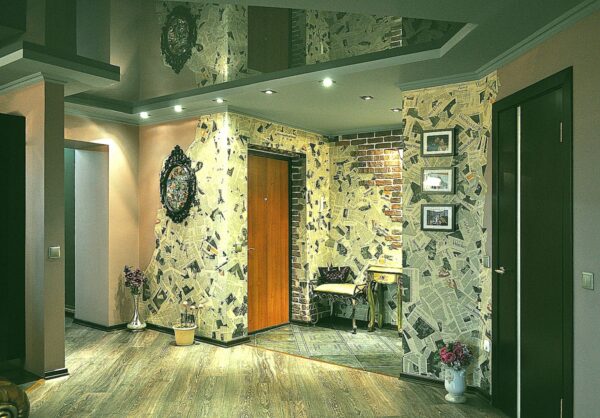 Потолки прихожей будет казаться выше, если на стены наклеить обои с вертикальным исполнением рисунков. Это могут быть, деревья, башни и т. д. Обои с горизонтальными элементами рисунка уменьшают высоту, что в прихожей крайне нежелательно;
