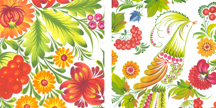 Родную Петриковскую роспись или Хохломские узоры впору использовать в качестве акцентных пятен на фоне нейтральной палитры в современном интерьере. Мотивы этих рисунков до наивности просты (птицы, цветы и животные, ягоды и фрукты), но в них ощущается напористый характер и неповторимый стиль.
